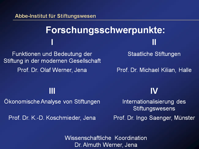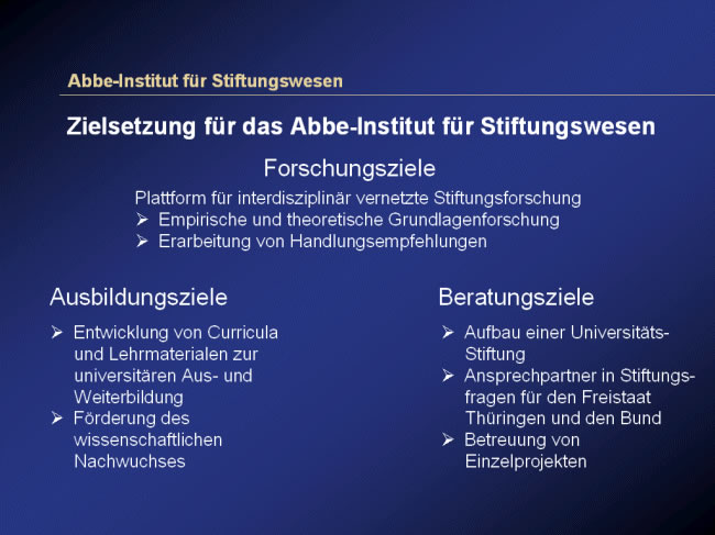 Ernst Abbe, einer der wohl berühmtesten Persönlichkeiten Jenas, schuf mit der Carl-Zeiss-Stiftung eine einmalige Form sozialen Unternehmertums, die sich gleichzeitig der Wissenschaft verpflichtet fühlte. Dieser Tradition ist auch die Ernst-Abbe-Stiftung - hervorgegangen aus der Carl-Zeiss-Stiftung - verbunden. Sie fördert wie kaum eine andere Stiftung in Thüringen wissenschaftliches Engagement und ist stets um eine enge Verbindung von wissenschaftlicher Leistung, technischer Umsetzung und sozialpolitischer Verantwortung bemüht. Diesen Leitmotiven folgt auch das am 17. Januar 2005 als eine Abteilung der Ernst-Abbe-Stiftung gegründete Abbe-Institut für Stiftungswesen an der Friedrich-Schiller-Universität zu Jena. Hierzu betreut es interdisziplinär